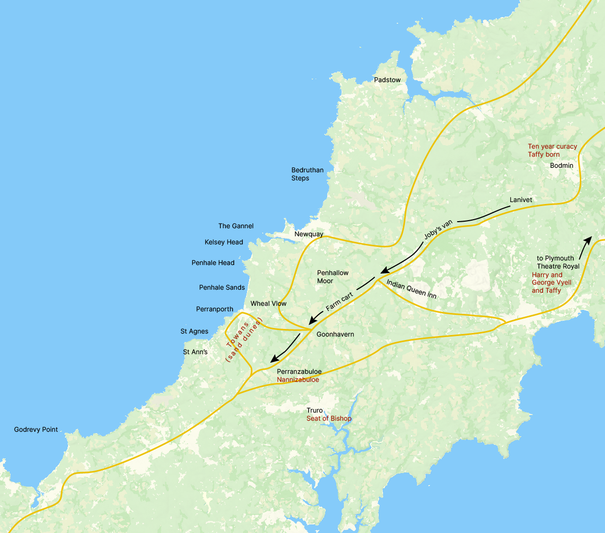 As Mr. Job ominously refuses to proceed further, the Raymonds hire a farmer’s cart for the rest of the journey. This takes them along the A30 to the junction with the B3285, from where it journeys to Goonhavern and then left along the A3075 to Perranzabuloe in the vicinity of St. Agnes, otherwise ‘Nannizabuloe’ and ‘St. Ann’s’. One of the fellow travellers, a sailor with a ‘ship of stars’ tattooed on his chest, will later be washed up on the beach from the wreck of the Samaritan.