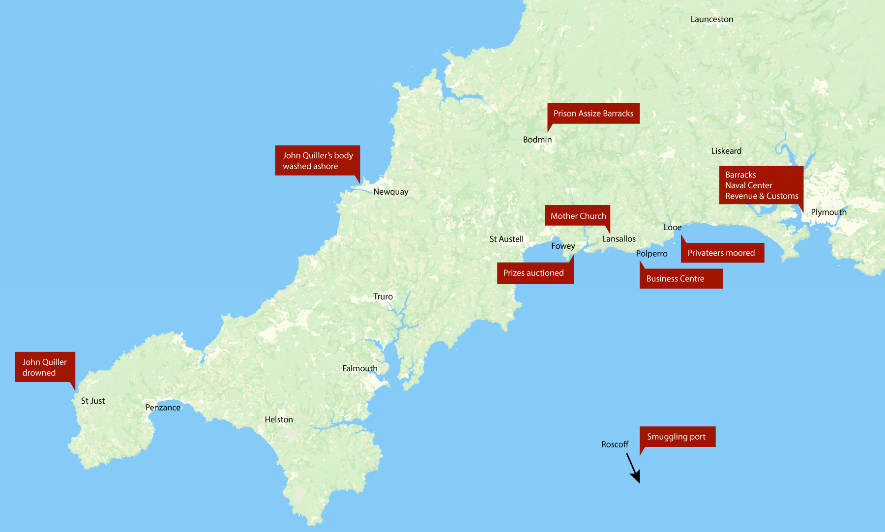 It soon became clear that the Quillers needed to be placed within the context of the smuggling, privateering and trading companies of the Cornish coast from Plymouth to Penzance. A broader context then demanded attention, an arc of maritime activity extending from the east coast of America to Brittany, Iberia and the western Mediterranean. For smuggling the hub was the island of Guernsey. Most of Q's novels and short stories lie within this arc.